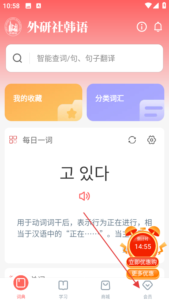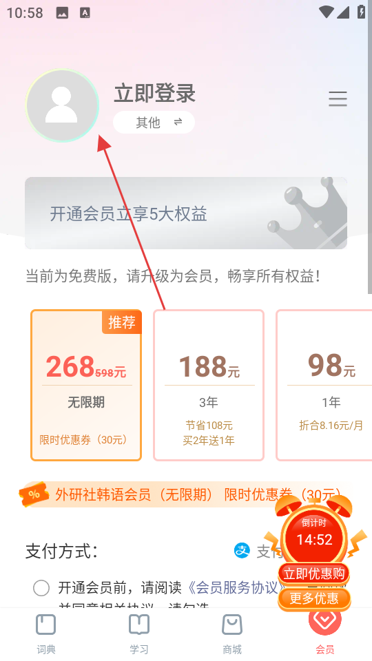 1、在词典页面,点击会员,进入会员页面。