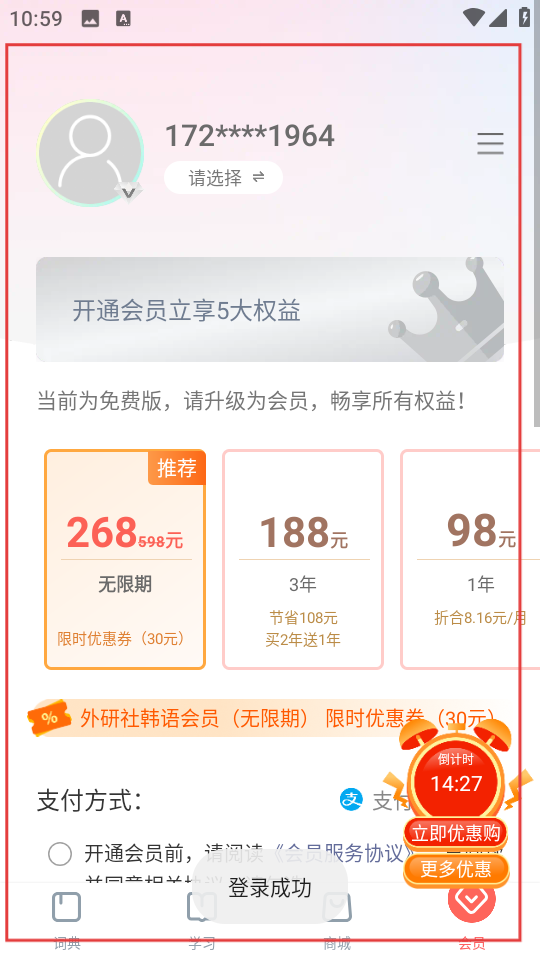 4、登录成功后,会显示登录成功,可查看会员相关权益和购买选项。