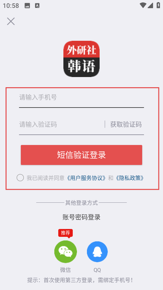 3、在登录页面,输入信息,勾选协议后,点击短信验证登录。