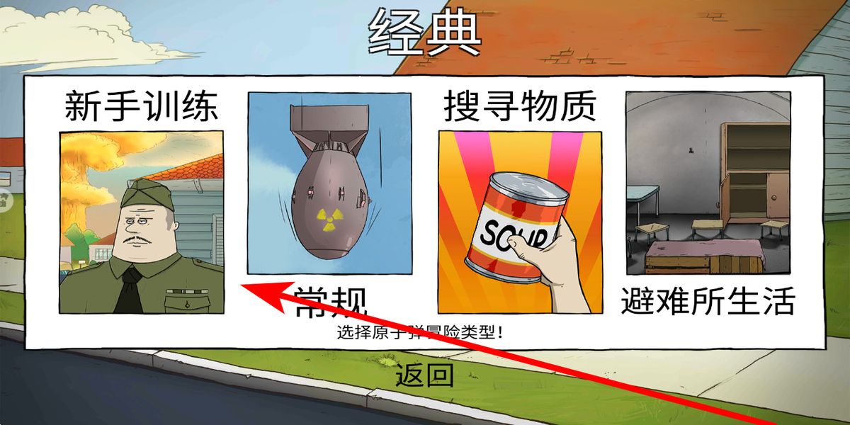 1、首先要选择模式,在众多模式里,挑选新手训练模式,该模式能让玩家了解核灾难中搜寻和生存的信息,为后续的冒险做好知识与操作上的准备。