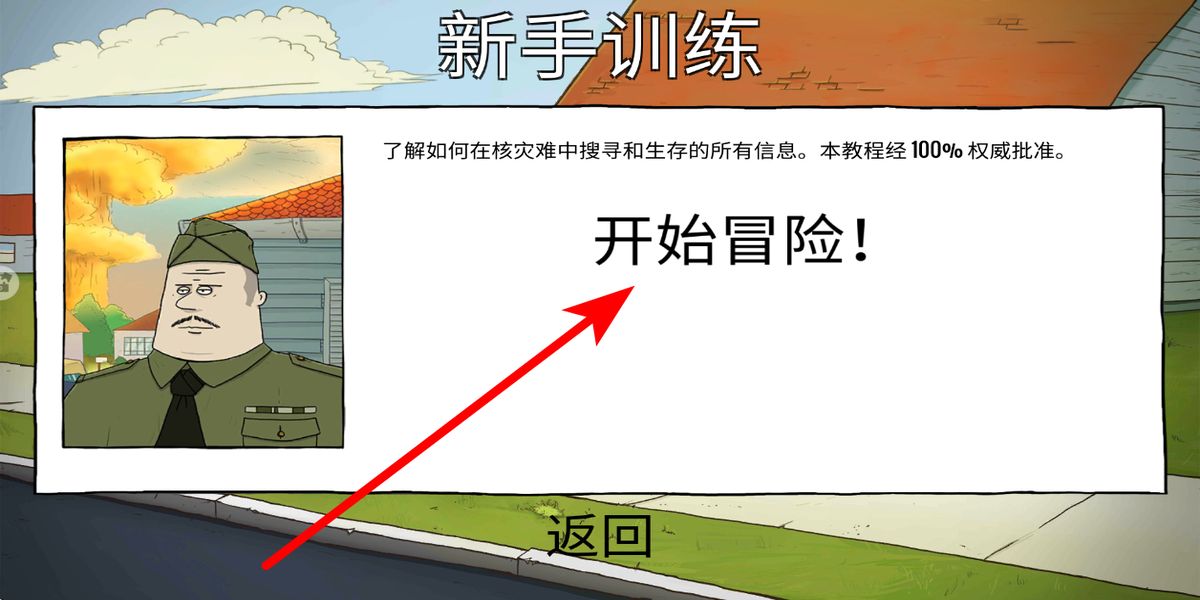 2、选好新手训练模式后,点击开始冒险,进入到核灾难场景相关的新手训练中,开启学习核灾难下生存技能的旅程,迈出核灾生存的第一步。