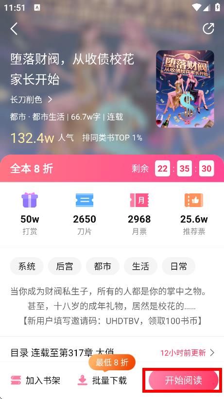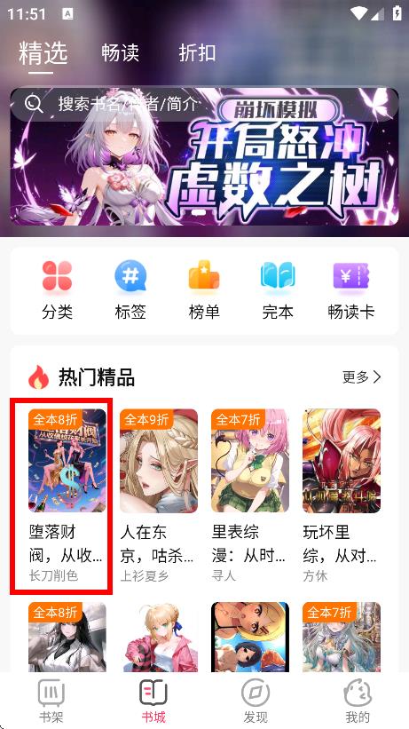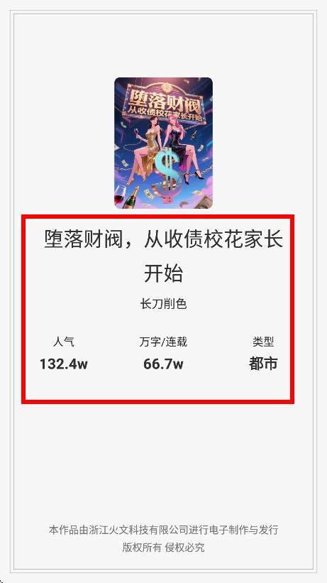 1、在书城页面,点击堕落财阀的书籍,进入书籍详情页。