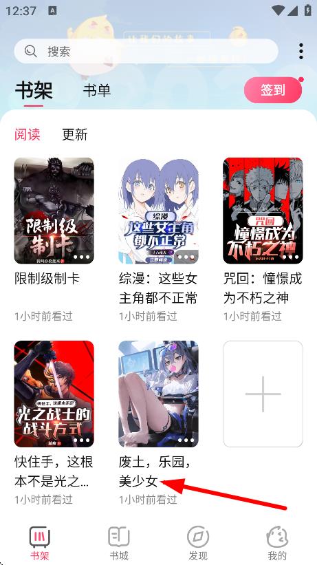 1、进入书架页面,点击废土,乐园,美少女书籍,进入书籍详情页。