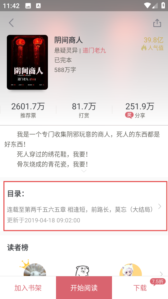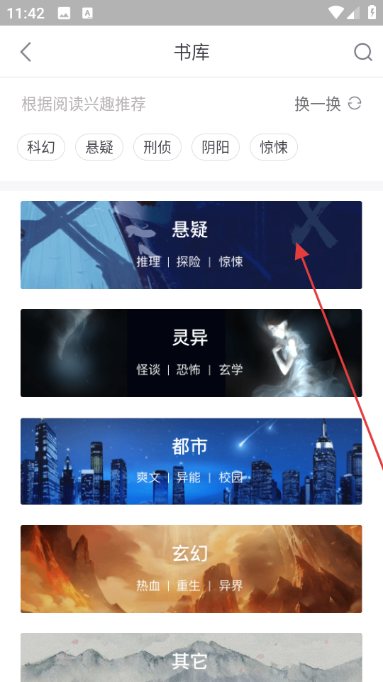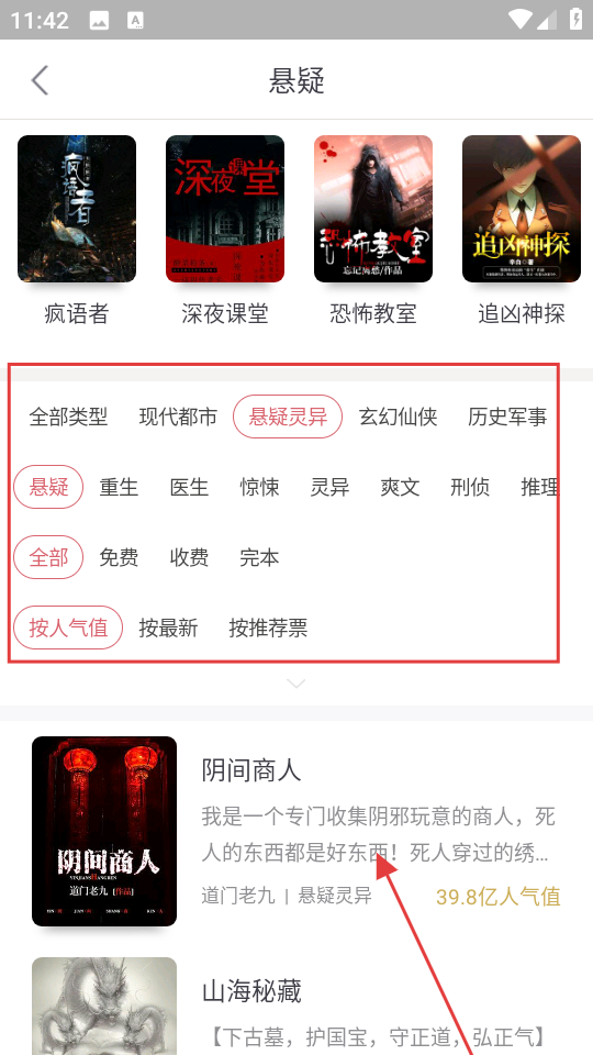 3、在悬疑分类页面,筛选出心仪的小说,如阴间商人。