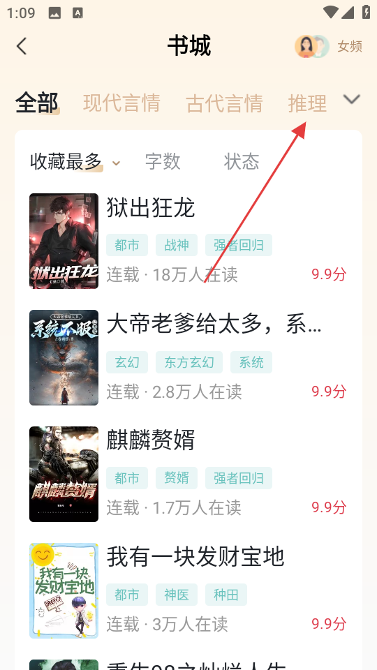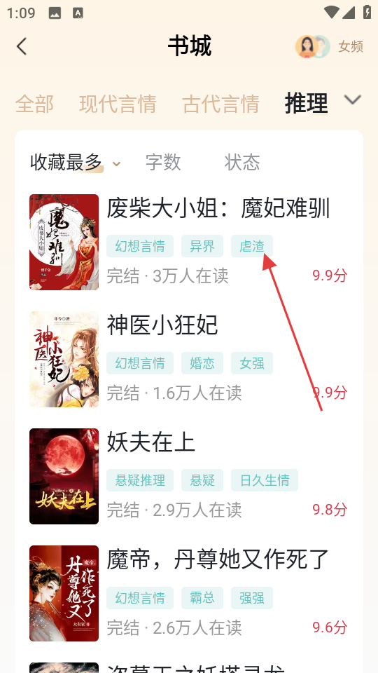 3、在推理分类下,选择心仪的小说,如废柴大小姐。