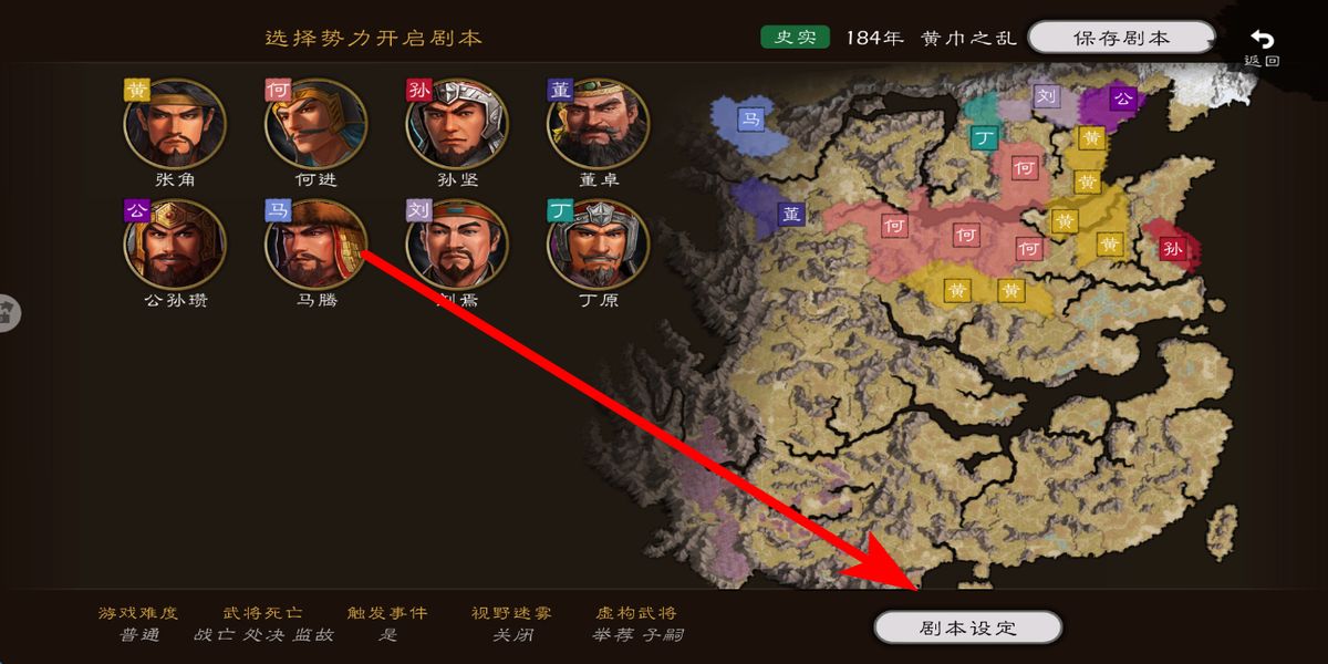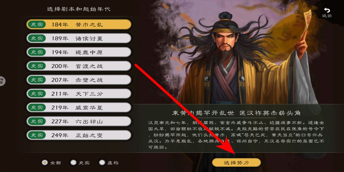 1、新手在章节选择界面,有黄巾之乱诸侯讨董等多个史实章节可选,不同章节对应不同的历史背景与开局情境,选好章节为后续征战奠定基础。