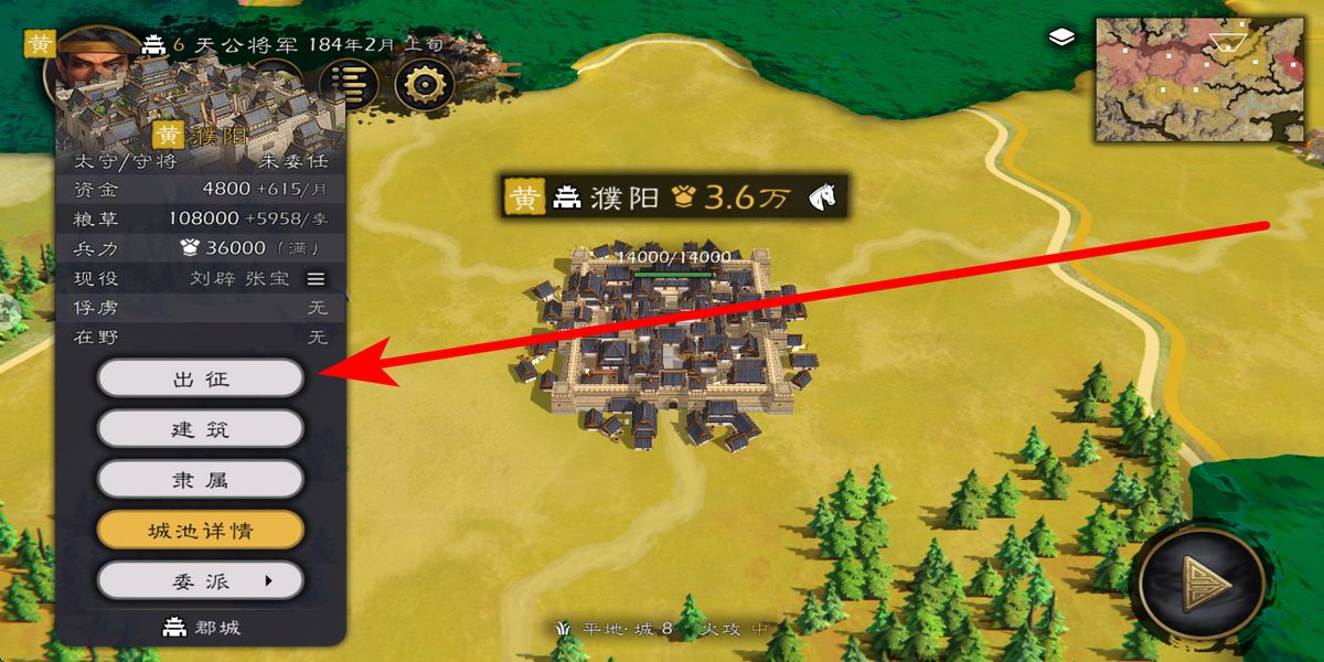 3、接着进行可以选择出征或者其他操作,在城池界面,点击出征,可派遣军队前往目标地点,开展攻城略地等行动,推进征战进程,扩大势力范围。