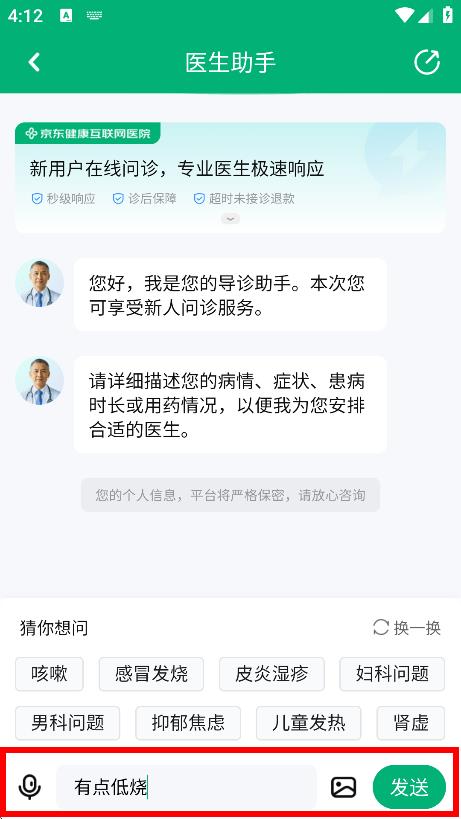 2、在助手页面,输入病情描述,点击发送,与导诊助手交流。
