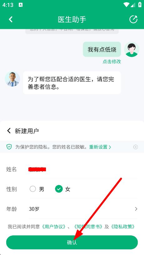 3、根据提示完善患者信息后,点击确认,提交信息。