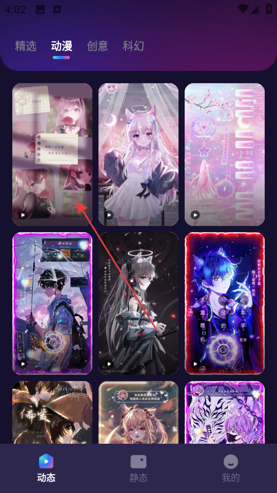 1、在动态壁纸页面,点击动漫,切换到动漫主题动态壁纸页面。