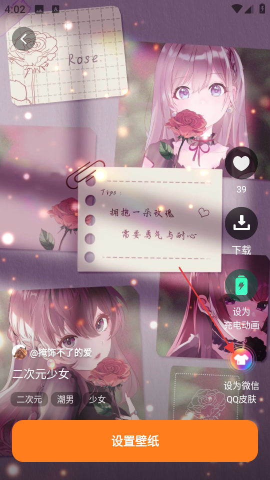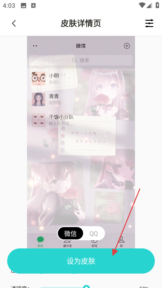 3、进入壁纸页面,点击设为微信QQ皮肤,进入皮肤详情页。