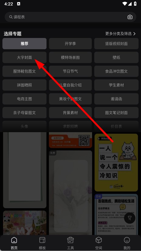 2、在选择专题区域中,点击大字封面选项,进入大字封面模板列表页面。