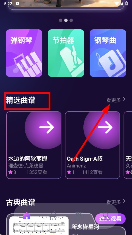 2、在页面中找到精选曲谱板块,点击其右侧的看更多。
