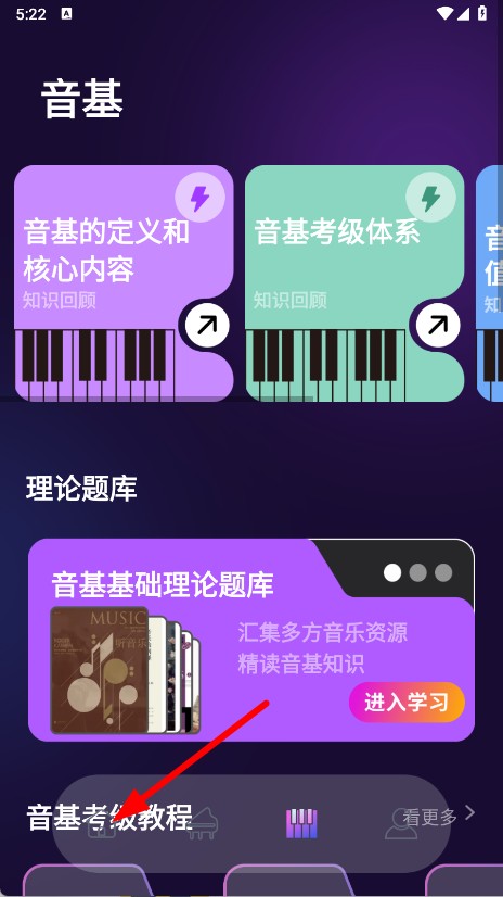 1、打开音基考级,找到并点击音基考级教程相关入口进入对应页面。