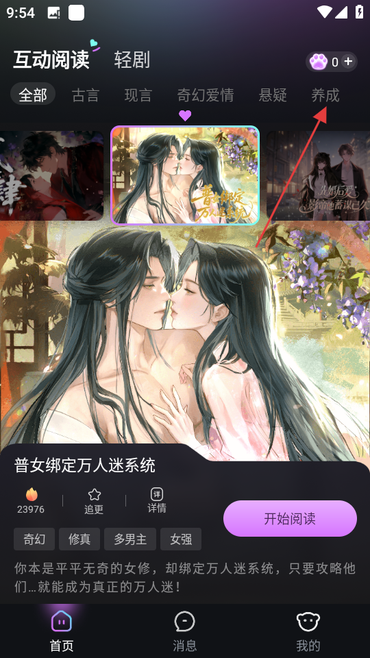 1、在互动阅读页面,点击养成,切换到养成类互动阅读页面。