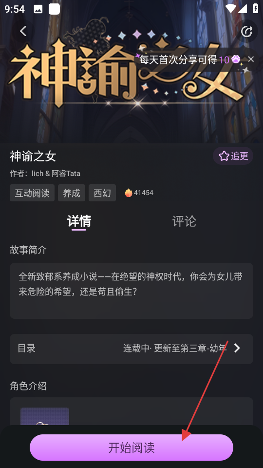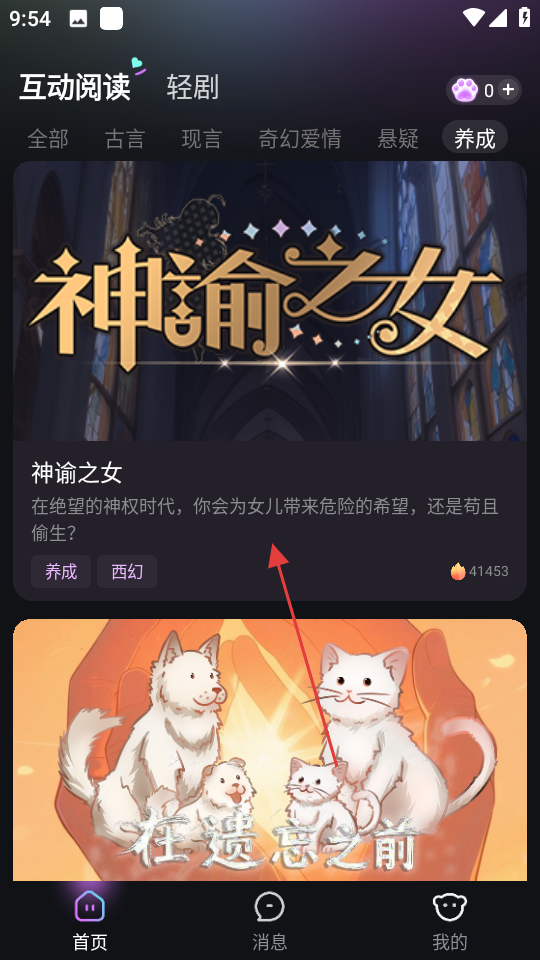 2、在养成类互动阅读页面,选择心仪的作品,如神谕之女。