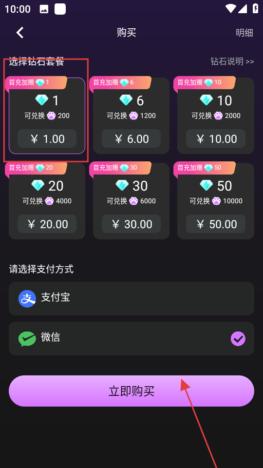 3、在购买页面,选择钻石套餐和支付方式后,点击立即购买。