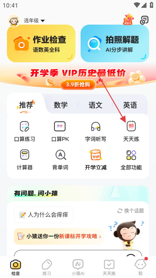 1、打开软件,在首页点击天天练,进入天天练页面。