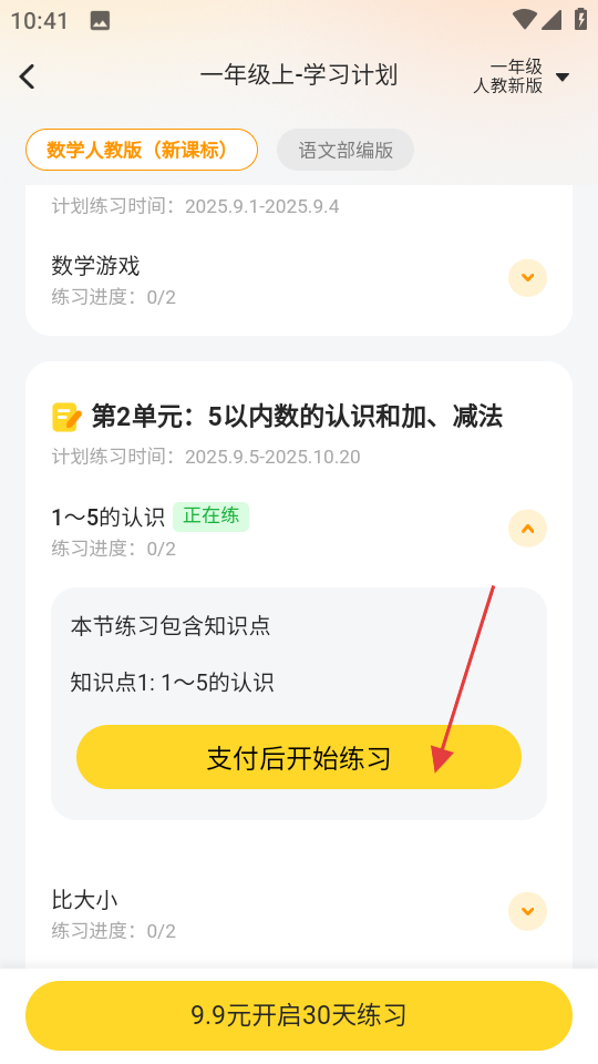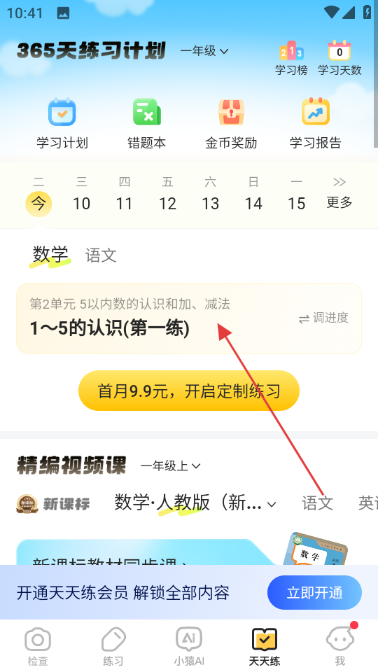 2、在天天练页面,选择要练习的内容,如1到5的认识第一练。