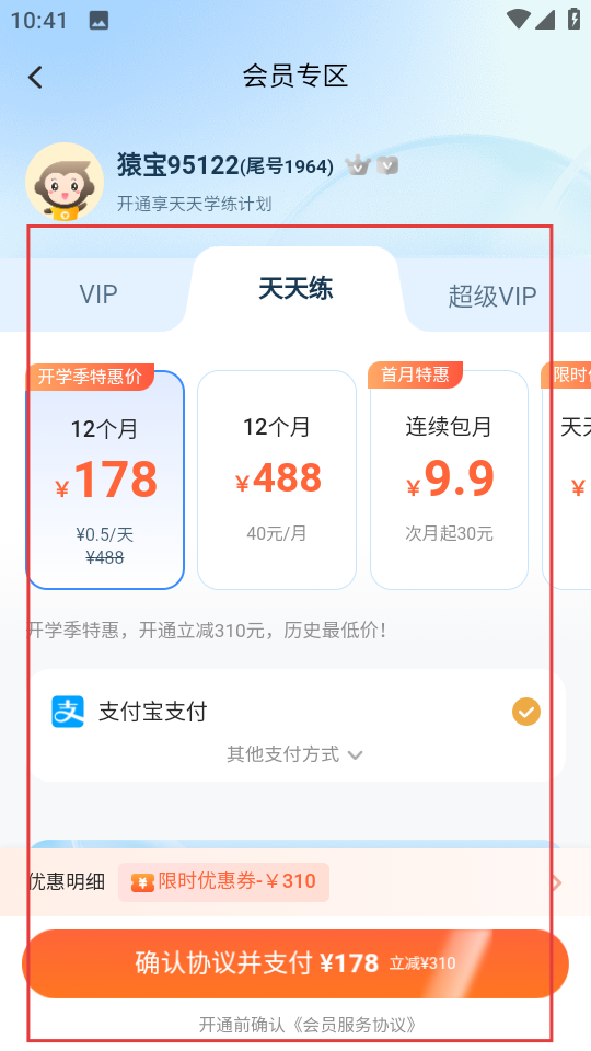 4、若需开通会员,选择套餐和支付方式后,点击确认完成开通。