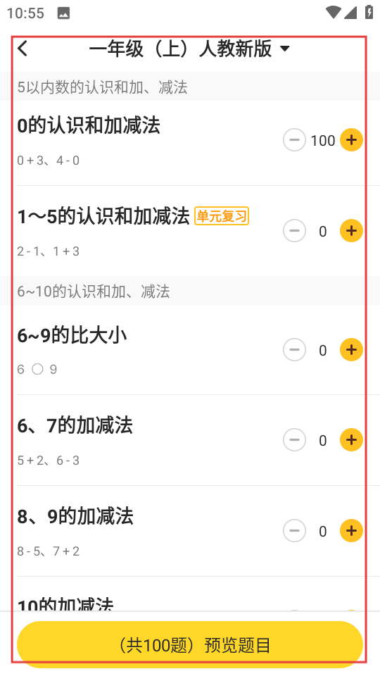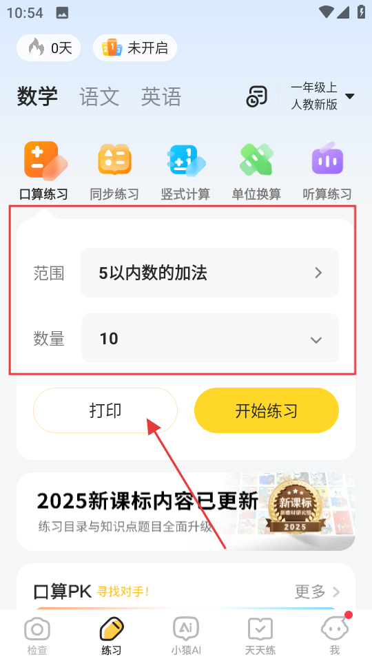 2、在练习页面选择口算练习,设置练习范围和数量后,点击打印,进入预览题目页面。