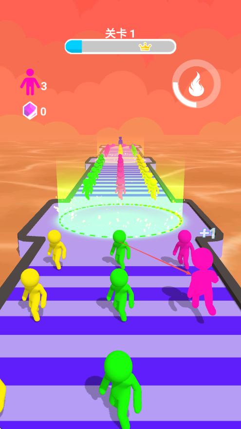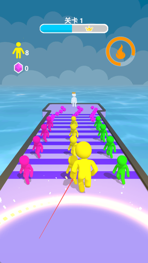 1、进入关卡1,滑动屏幕操控角色在跑道上移动,召集同颜色小人壮大队伍。