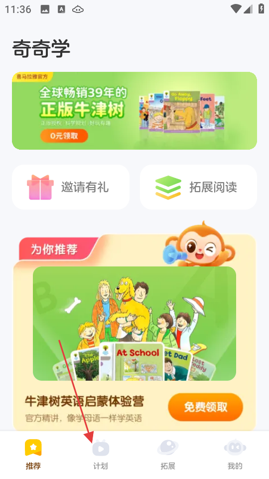 1、在奇奇学推荐页面,点击计划,进入计划页面。