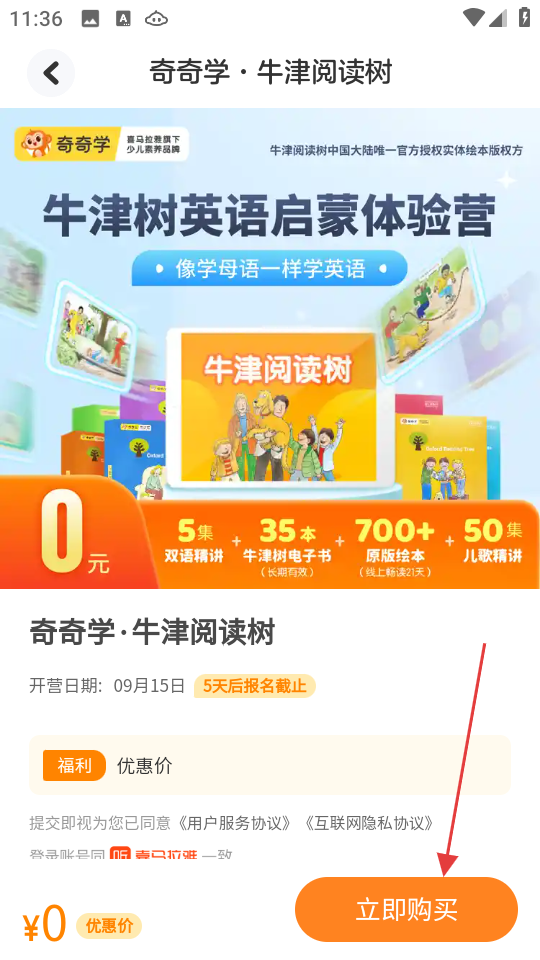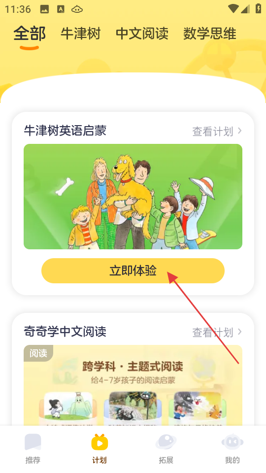 2、在计划页面,点击立即体验,进入牛津树英语启蒙内容页面。