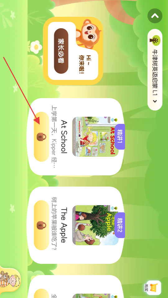 3、在牛津树英语启蒙内容页面,选择要学习的内容,如AtSchool。