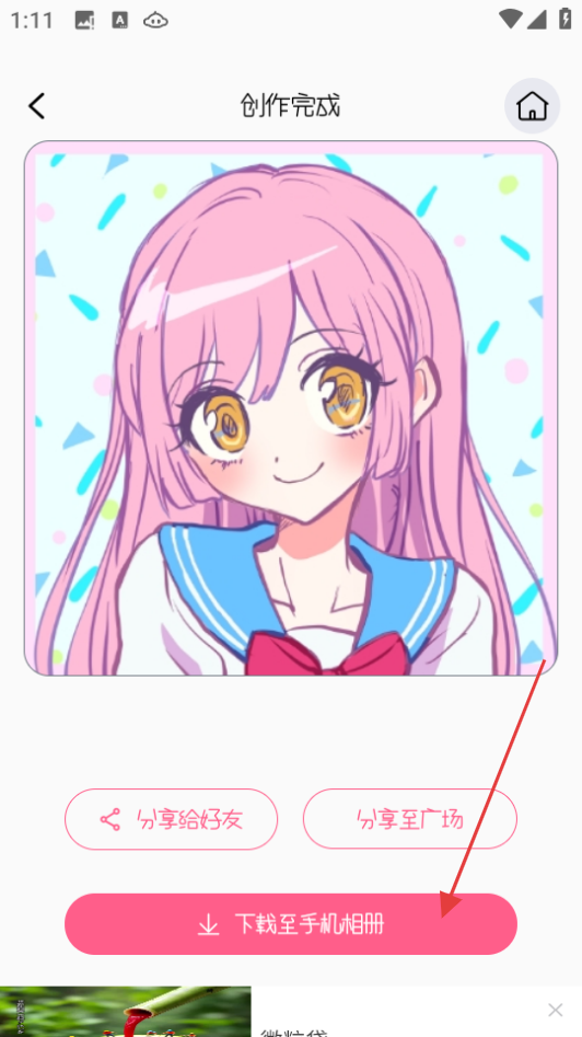 3、生成保存作品:完成所有元素搭配与细节调整后,将创作好的二次元头像保存至个人相册,可直接点击分享按钮。