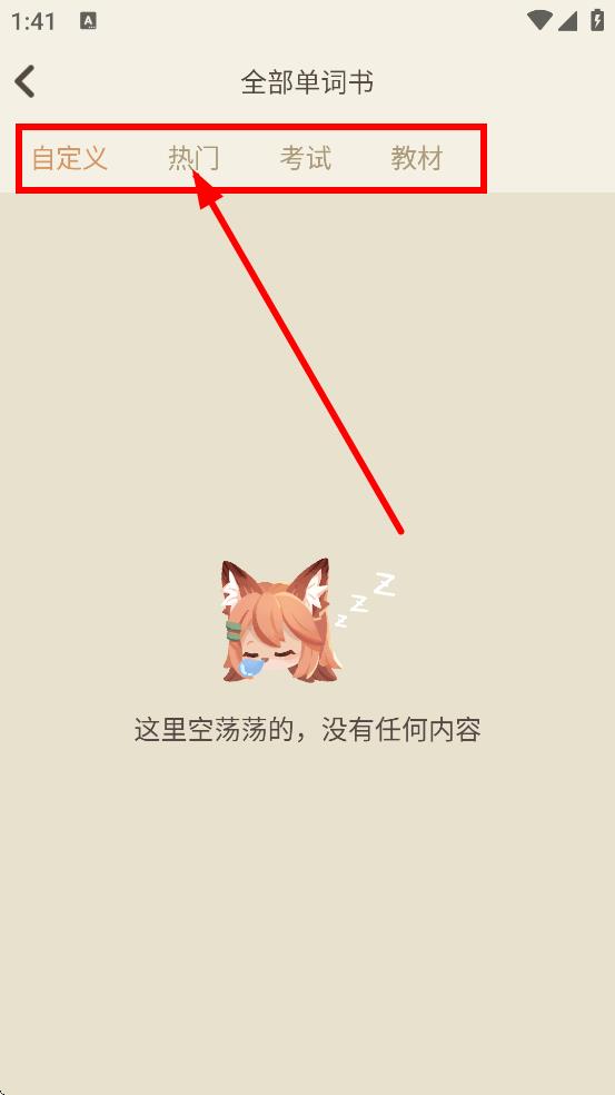 2、在全部单词书页面,可选择自定义,热门,考试,教材等分类。