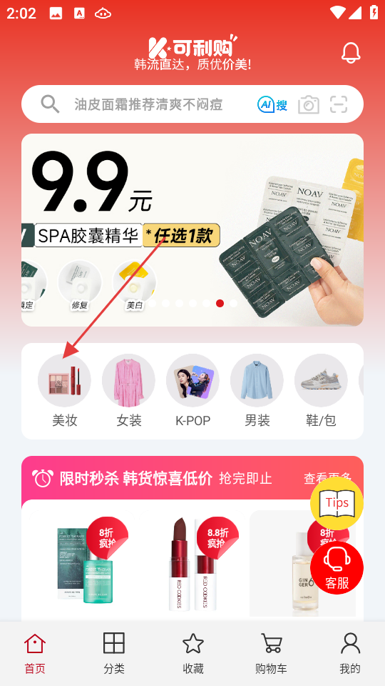 1、在可利购首页,点击美妆分类,进入美妆页面。
