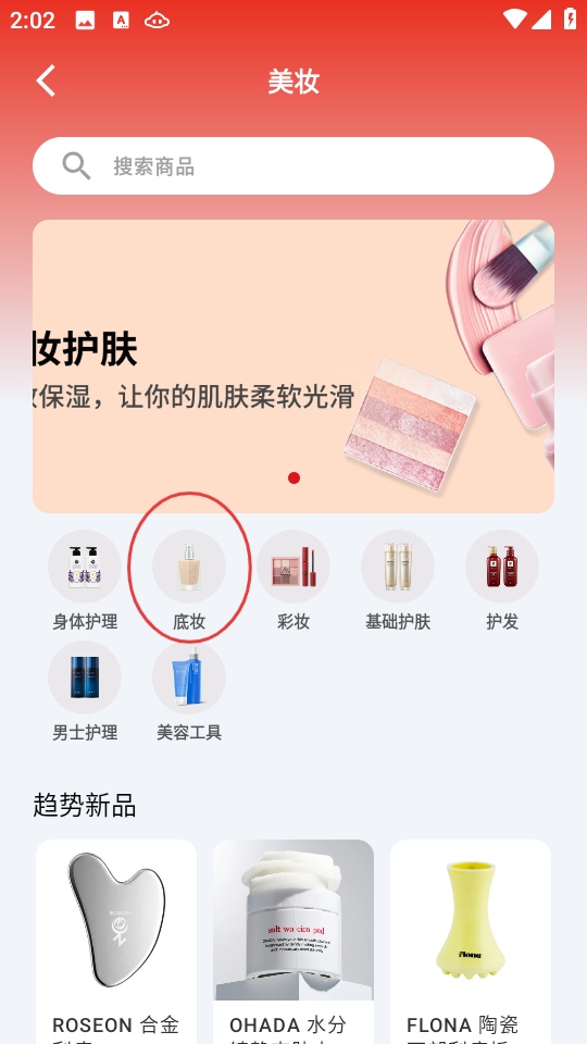 2、在美妆页面,点击底妆分类,查看底妆类商品。