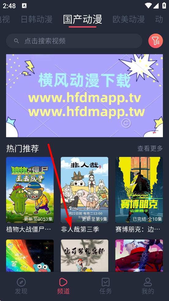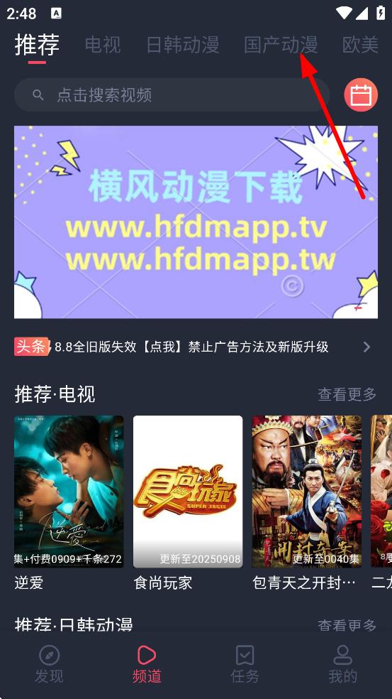 1、在推荐页面,点击国产动漫,进入国产动漫分类页面。