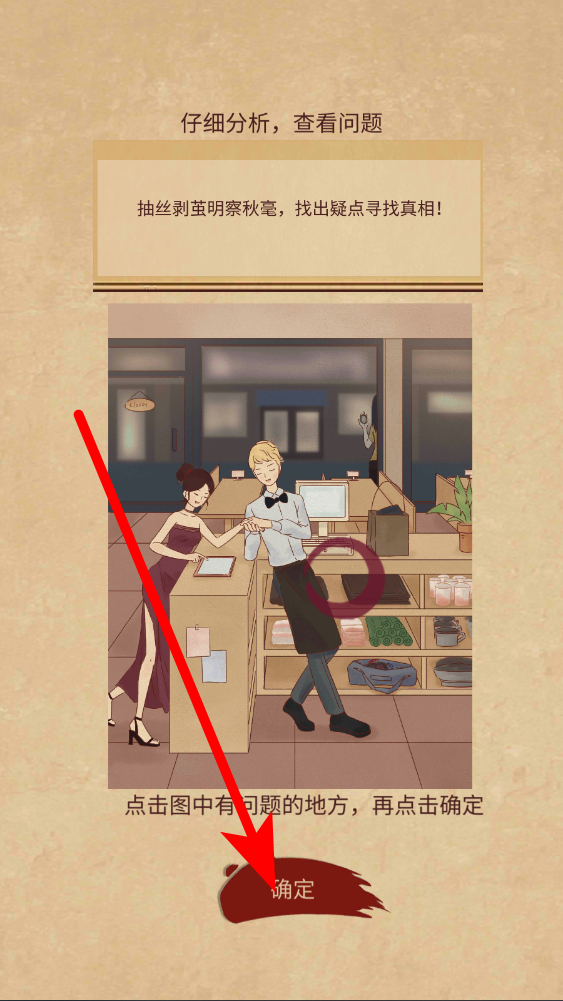 2、然后分析画面找疑点,进入关卡后,仔细观察给出的画面,依据提示,点击图中有问题的地方,再点击确定,尝试找出案件相关的关键线索。