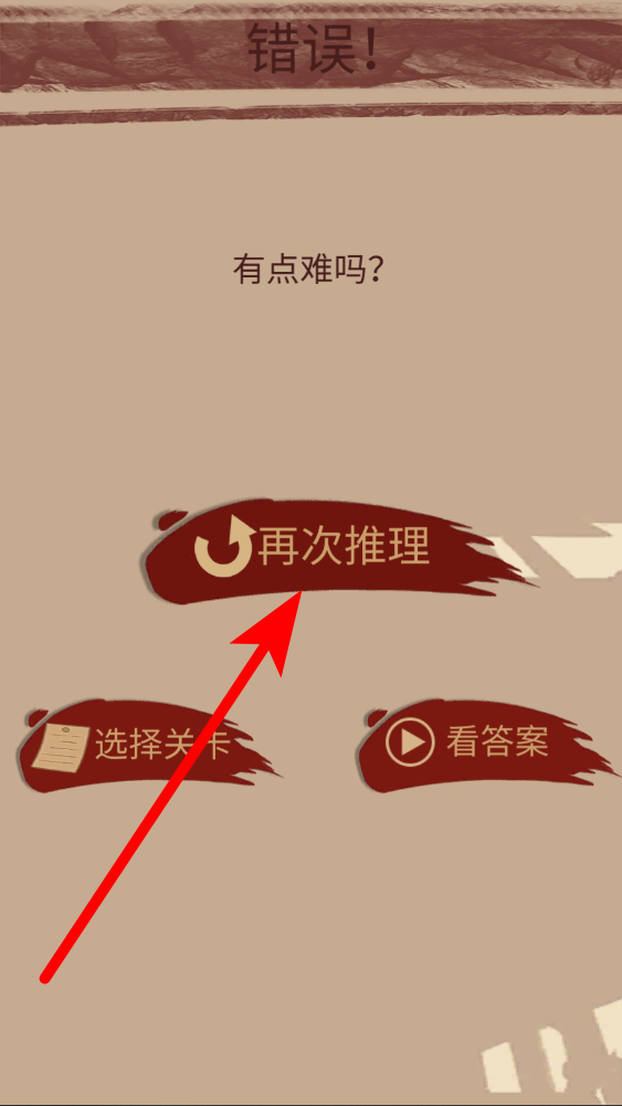 4、最后进行推理尝试,若推理错误,会出现提示界面,此时可选择再次推理,重新梳理线索,再次尝试找出真相,不断接近案件的答案。