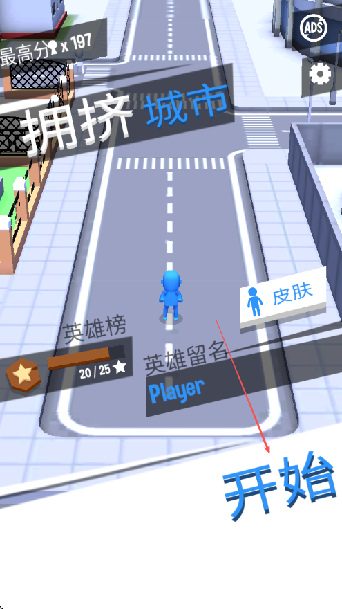1、在游戏主界面,点击开始按钮进入游戏,可点击皮肤更换角色外观,留意最高分和英雄榜。