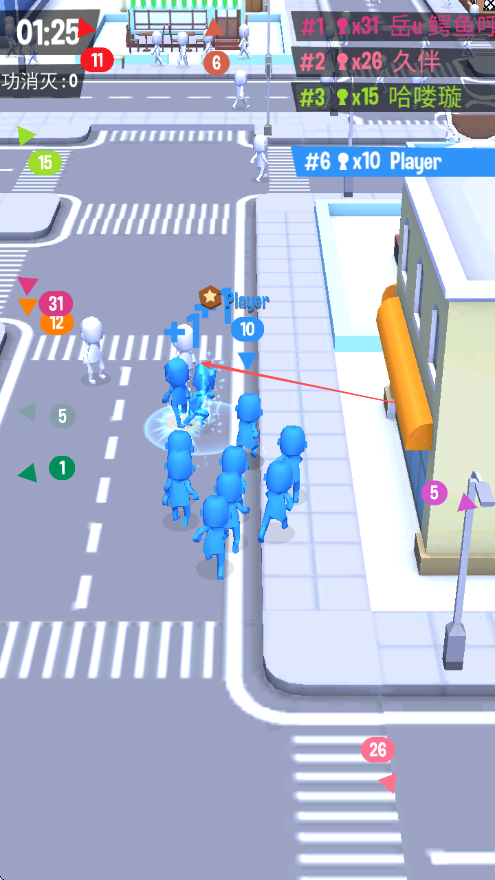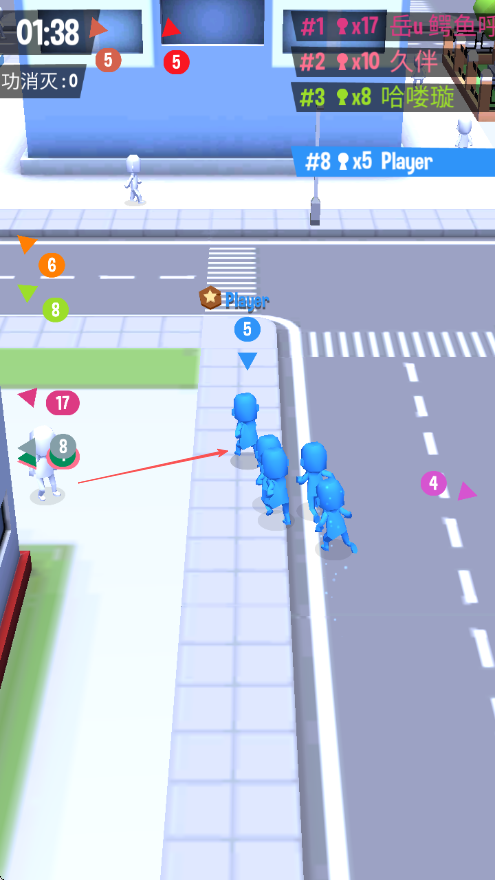 3、区域控制技巧:人数壮大后,可占据城市关键通道如桥梁、路口,拦截过往的白色小人与弱小玩家小队,形成“以点控面”的吞噬优势,加速扩大势力范围。