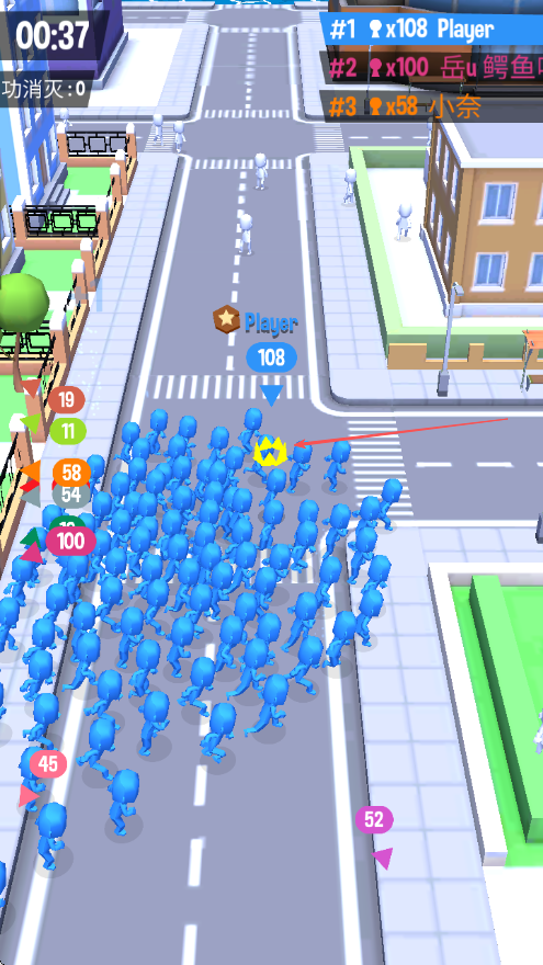 拥挤世界以疯狂的战斗场面为亮点,打造了一款极具冲击力的小人吞噬类作品,在这个充满对抗的世界里,玩家将控制一队带有专属颜色的小人,开启以吞噬扩张、对抗称霸为目标的冒险,核心玩法围绕吞噬展开,玩家需指挥颜色小人在城市场景中寻找并吞噬那些闲逛的白色无颜色小人,每吞噬一个白色小人,自己的小队人数就会相应增加。