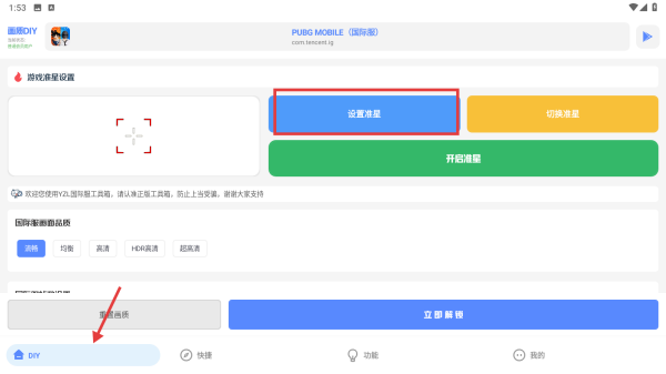 2、选择准星与适配机型:在软件准星设置板块,挑选喜欢的准星款式如发光准星并应用;软件会自动识别手机类型,用户可根据推荐选择适配的画质参数,确保运行稳定。