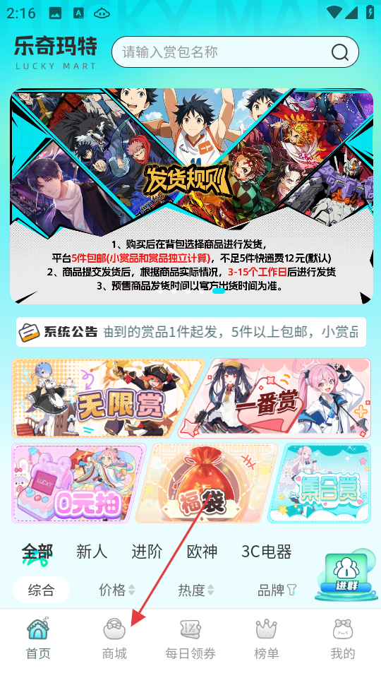 1、在乐奇玛特首页,点击底部商城,进入商城页面。