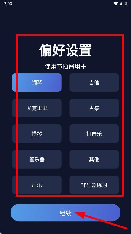 1、进入偏好设置页,选择节拍器适用的乐器,点击继续。