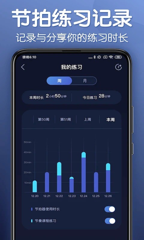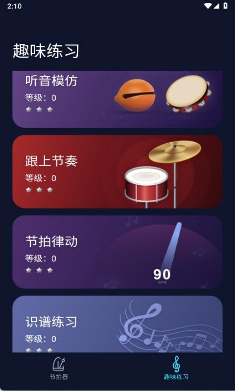 3、节拍记录助复盘提升:支持记录每次练习的节拍设置与练习时长,在练习记录板块查看过往数据,针对节奏薄弱的段落,可调用历史设置重复练习,针对性提升节奏感。