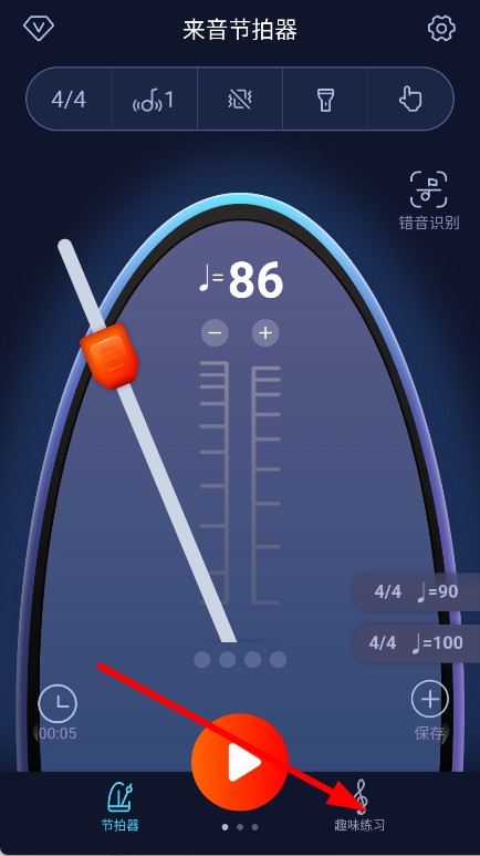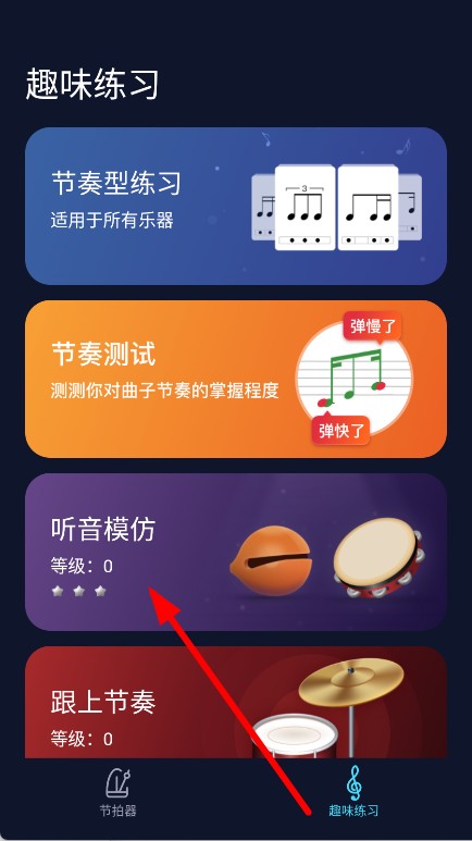 1、在来音节拍器主界面,点击底部趣味练习选项。