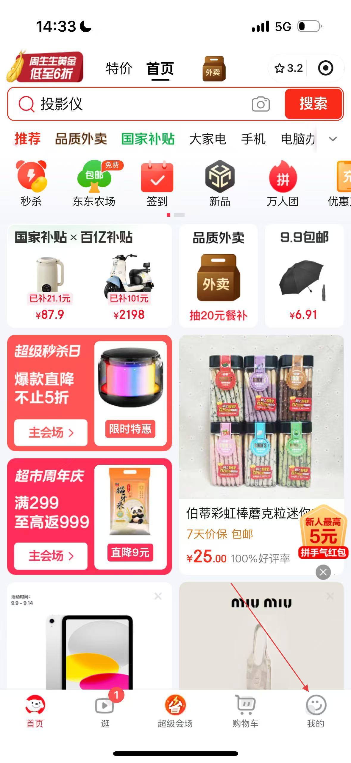 1、在京东首页,点击右下角我的,进入个人中心页面。