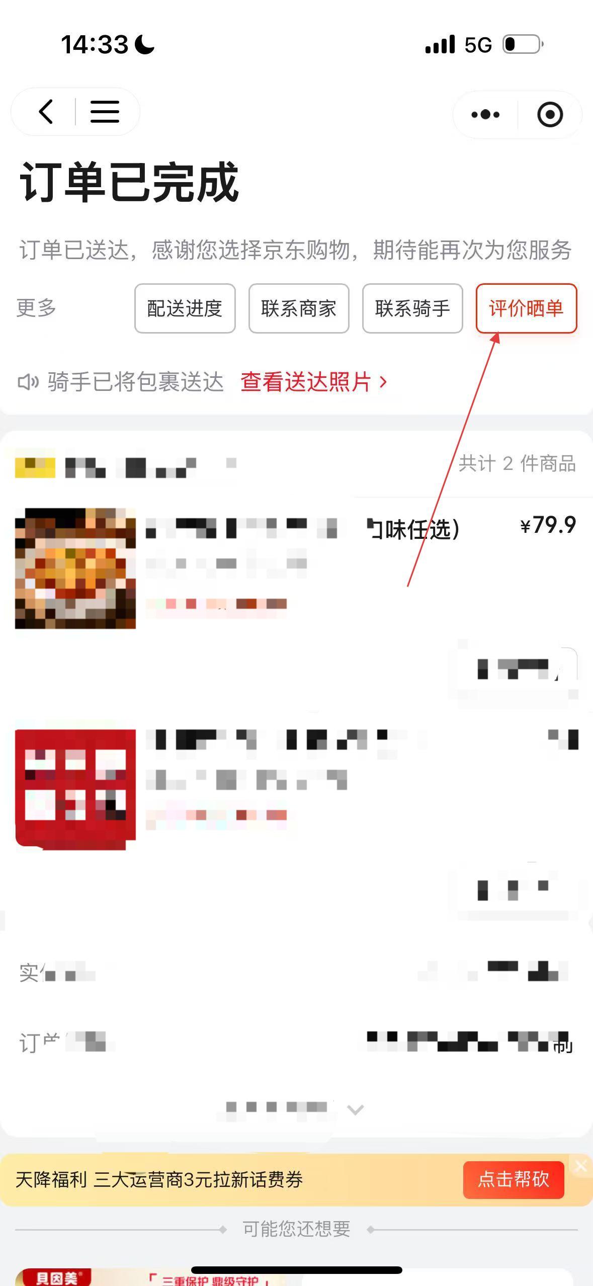 4、在订单详情页,点击评价晒单,可进行订单评价。
