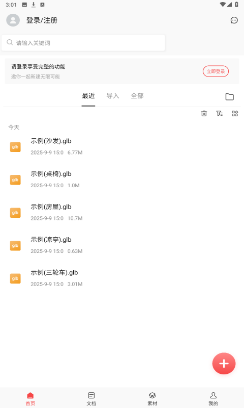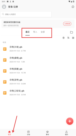 1、打开3D模型资源应用,进入首页,可查看最近、导入、全部等分类下的文件。