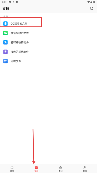 2、点击底部文档选项,浏览QQ接收的文件、微信接收的文件等各类文档分类。