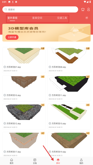 3、点击素材选项,查看室外景观、家具空间等各类3D模型素材。