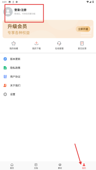 4、点击我的选项,进行登录/注册操作,还可查看升级会员等专属权益及各类设置入口。